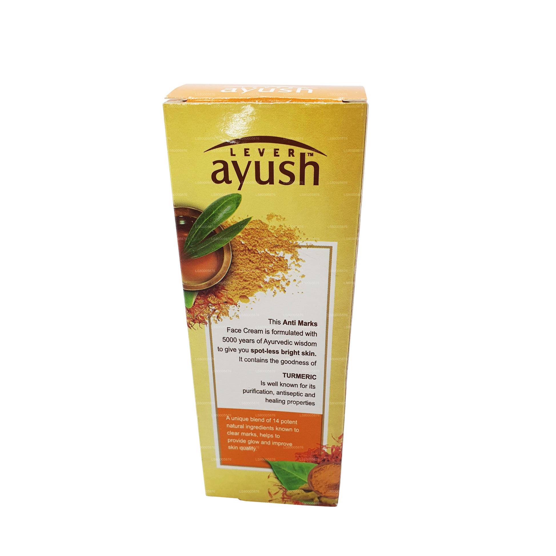 (SKU: LS80005876)Ayush Anti Marks Face Cream contains the goodness of Turmeric (Haldi) known for its purification and antiseptic properties and Kumkumadi Tailam, to cure marks, lighten skin colour and improve skins quality for spot-less fair skin.