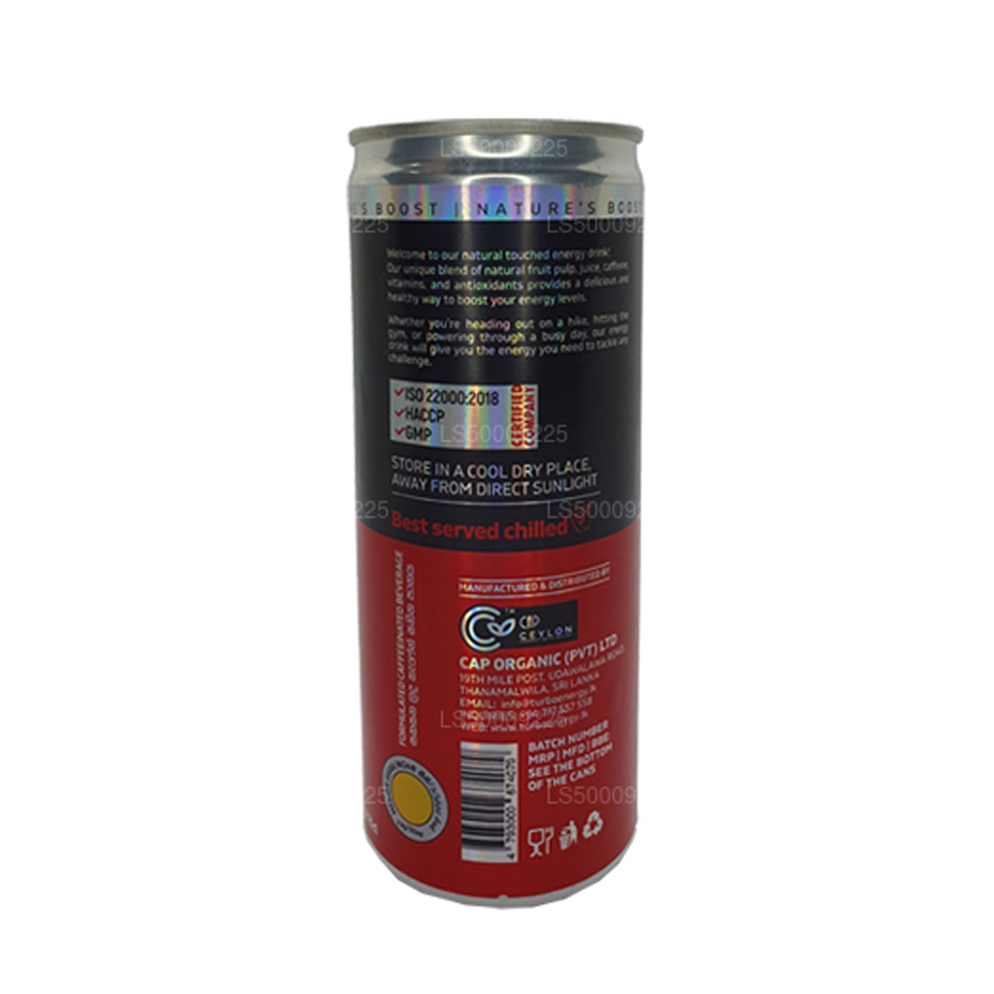 Ingredients: Carbonated water,Sugar,sucrose,Citric Acid (INS330),Natural Lime Juice,Natural Soursop Juice, Natural Mixed Fruit Flavours,Sodium citrate(INS331) Taurine(400.00mg/100ml)Caffeine(32.00mg/100ml) Niacin,pantothenic Acid,Vitamin B6,Vitamin B12,permitted preservatives(INS211).