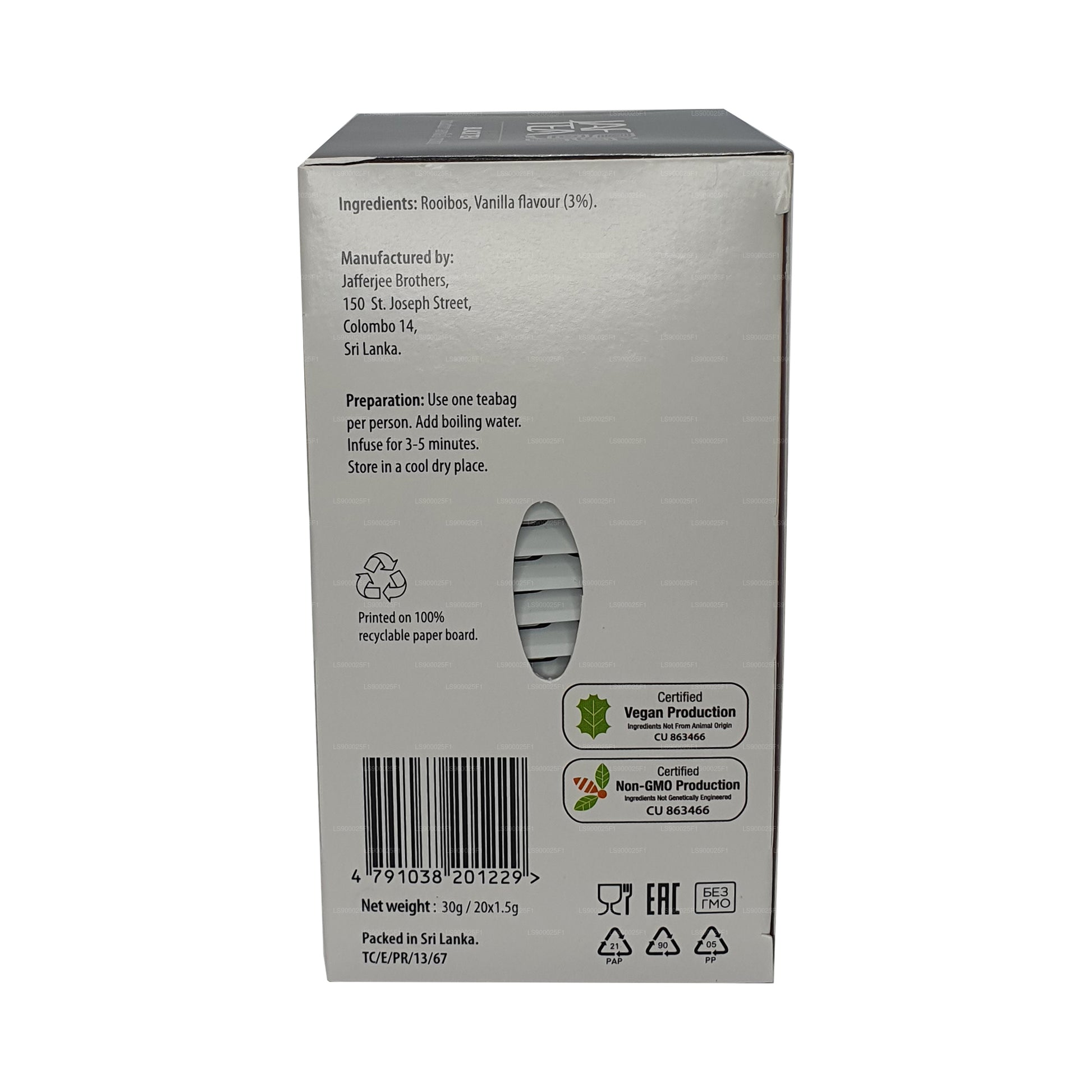 An refreshing blend of rooibos tea plus vanilla flavor. Enjoy the creamy taste of vanilla. It is non-caffeine. Enjoy your sweet and relaxing rooibos tea moment. It is stapleless and uses aluminum foil for individual wrapping to improve storage capacity.