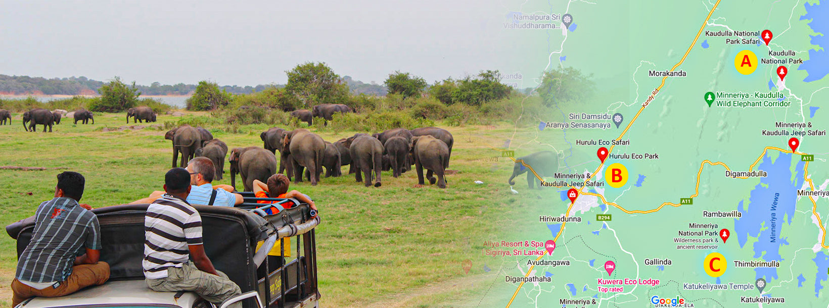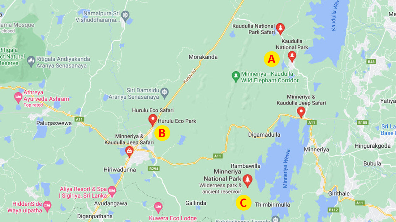 There are three national parks in close proximity within that region. They are, (A) the Kaudulla National Park(B) the Hurulu Eco Park, and (C) the Minneriya National Park. All of the three parks are immensely popular among locals and foreigners the world over for their large herds of elephants. Generally, each year during the months of July to September large groups of elephants are found in the Minneriya National Park and then they migrate to Kaudulla National Park during the months October to November due to high rains and lakes getting filled up. Then the elephants move on to Hurulu Eco Park for the final leg of their migration during the month of December to January.