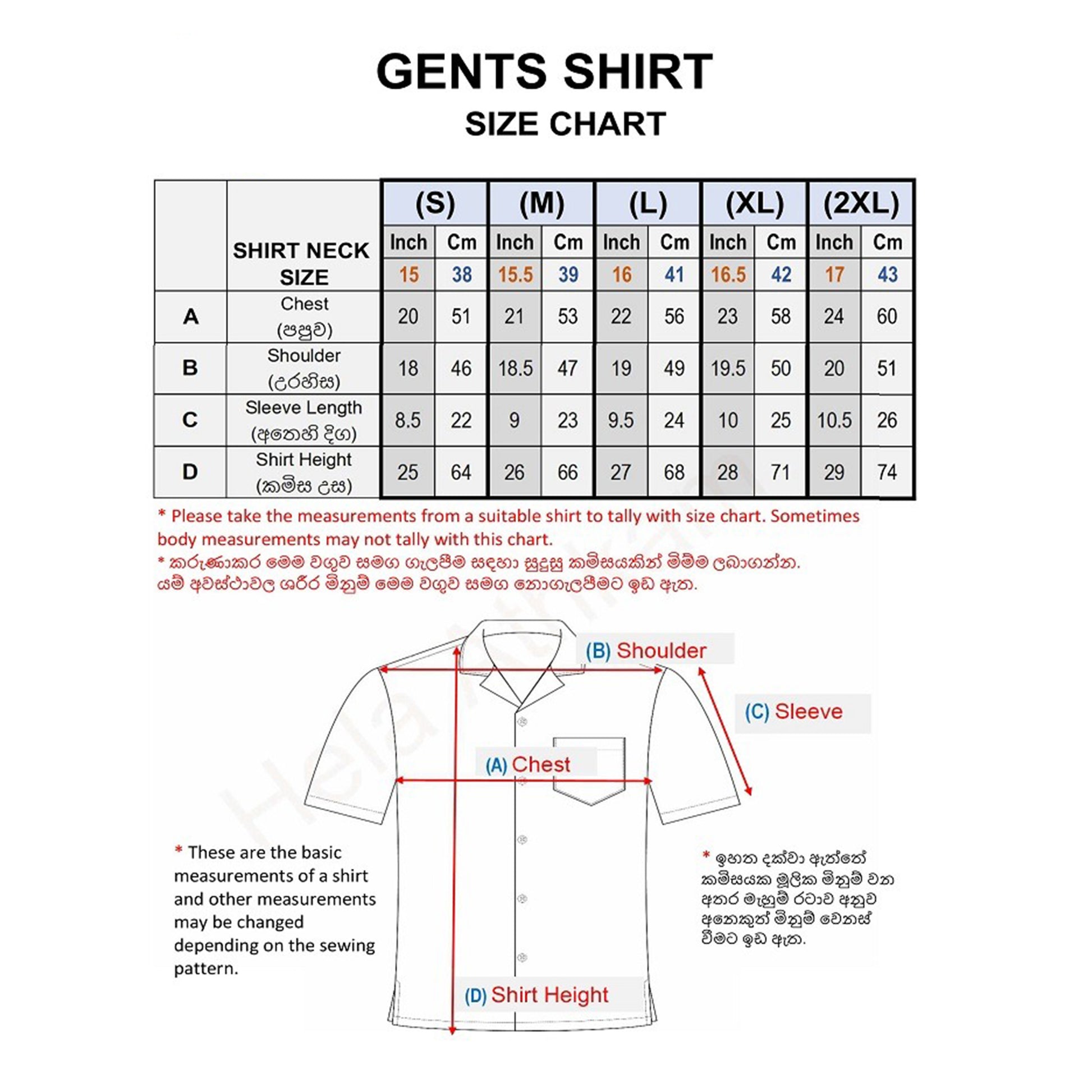 Shirts are available in Small to 2XL sizes (15″ to 17″).