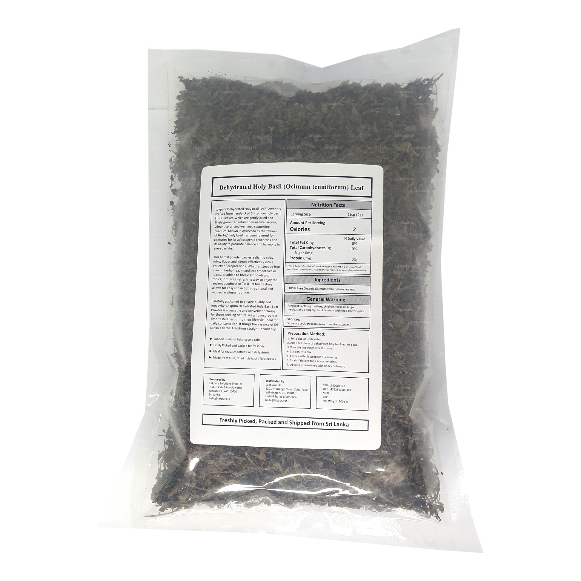 (SKU: LS40000DA2) Holy Basil which is popularly known as Tulsi is a native to South Asian countries and is considered to have important medicinal value. Lakpura offers you the dehydrated form of the tulsi plant. Known as the Elixir of Life for its many health benefits, all parts of the plant especially the leaves and purple flowers are considered beneficial.