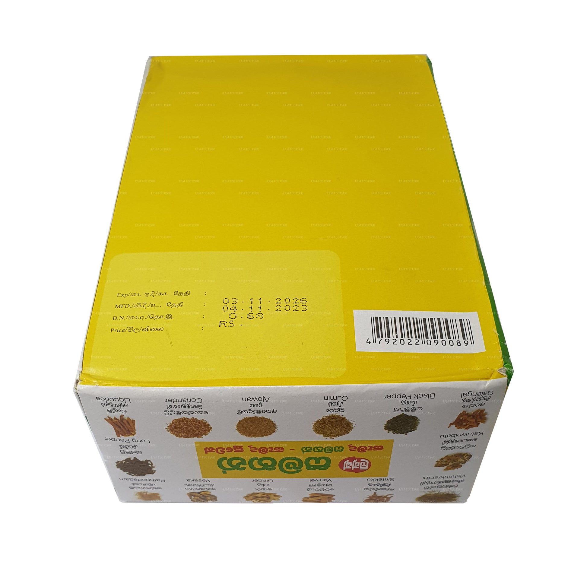 Ingredients: Vishnukranthi (Evolvulus alsinoides), Katuwelbatu (Solanum xanthocarpum), Ginger (Zingiber Officinale), Pathpadagam (Hedyotis corymbosa), Galangal (Alpinia galanga). Cumin (Cuminum cyminum). Ajowan (Carum copticum), Siritekku (Premna herbacea), Venivel (Coscinium fenestratum), Vasaka (Adhatoda vasica), Long Pepper (Piper longum), Black Pepper (Piper nigrum), Coriander (Coriandrum sativum), Liquorice (Glycyrrhiza) and Cane Sugar (Saccharum officinarum)